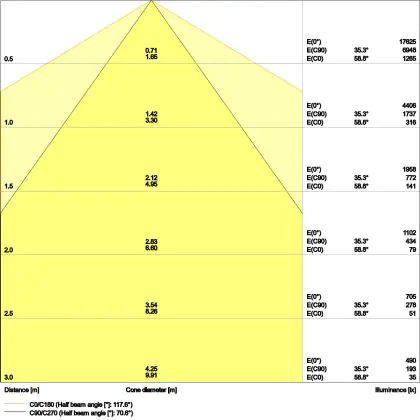 Der Abstrahlwinkel bezeichnet den Winkel, in dem das Licht aus der Lichtquelle ausgestrahlt wird. Er wird in Grad (D) angegeben. Je geringer die Gradzahl des Abstrahlwinkels ist, desto kleiner ist auch der Durchmesser des Lichtkegels, den die Lichtquelle produziert.