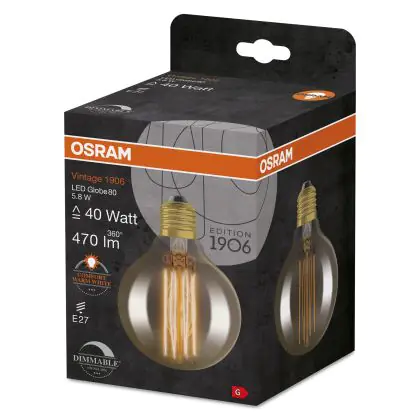 Osram Vintage 1906 LED E27 Globe Filament Gold 80mm 5.8W 470lm - 822 Extra Warm White | Dimmable
