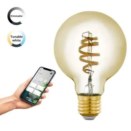 Cette ampoule Eglo Connect.Z Smart LED Globe E27 Filament Ambre 4.9W 360lm - 827-865 Accordable Blanc | Dimmable - Remplacement 25W avec son efficacité lumineuse de lumen par watt vous permettra de profiter d’un éclairage de qualité. Avec sa durée de vie de 25000 heures, vous n’aurez pas à vous soucier de son remplacement avant quelques années.