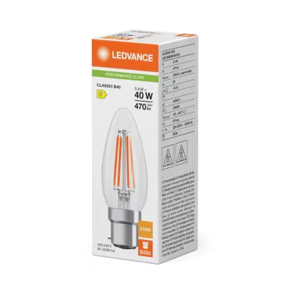 Cette ampoule Ledvance Classic LED B22 Bougie Filament Claire 3.4W 470lm - 827 Blanc Très Chaud | Remplacement 40W avec son efficacité lumineuse de lumen par watt vous permettra de profiter d’un éclairage de qualité. Avec sa durée de vie de 15000 heures, vous n’aurez pas à vous soucier de son remplacement avant quelques années.