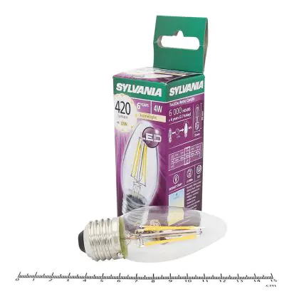 Cette ampoule Sylvania ToLEDo E27 Bougie Filament Claire 4W 420lm - 827 | Remplacement 40W avec son efficacité lumineuse de lumen par watt vous permettra de profiter d’un éclairage de qualité. Avec sa durée de vie de 15000 heures, vous n’aurez pas à vous soucier de son remplacement avant quelques années.